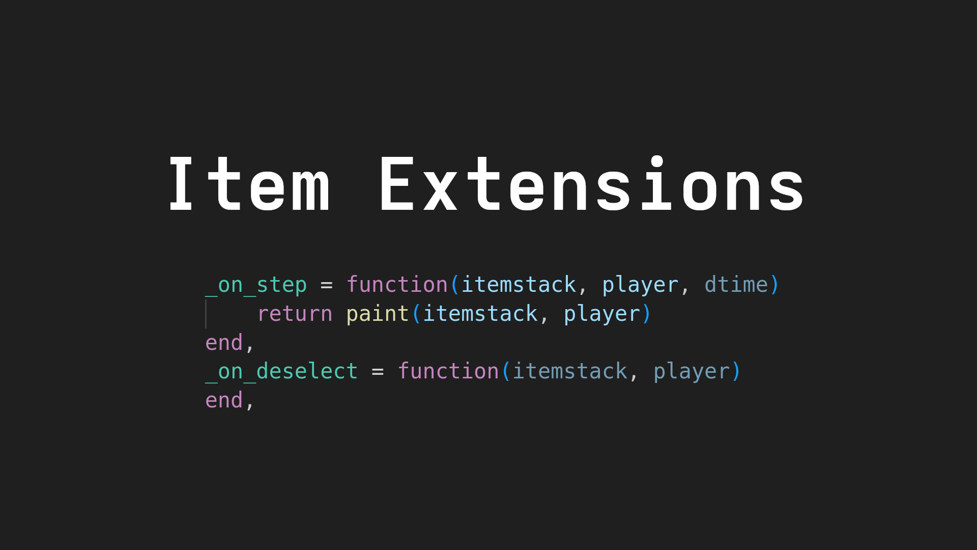 - Items know when they are selected and deselected (wielded) and selected items are deselected when dropped or on player logout