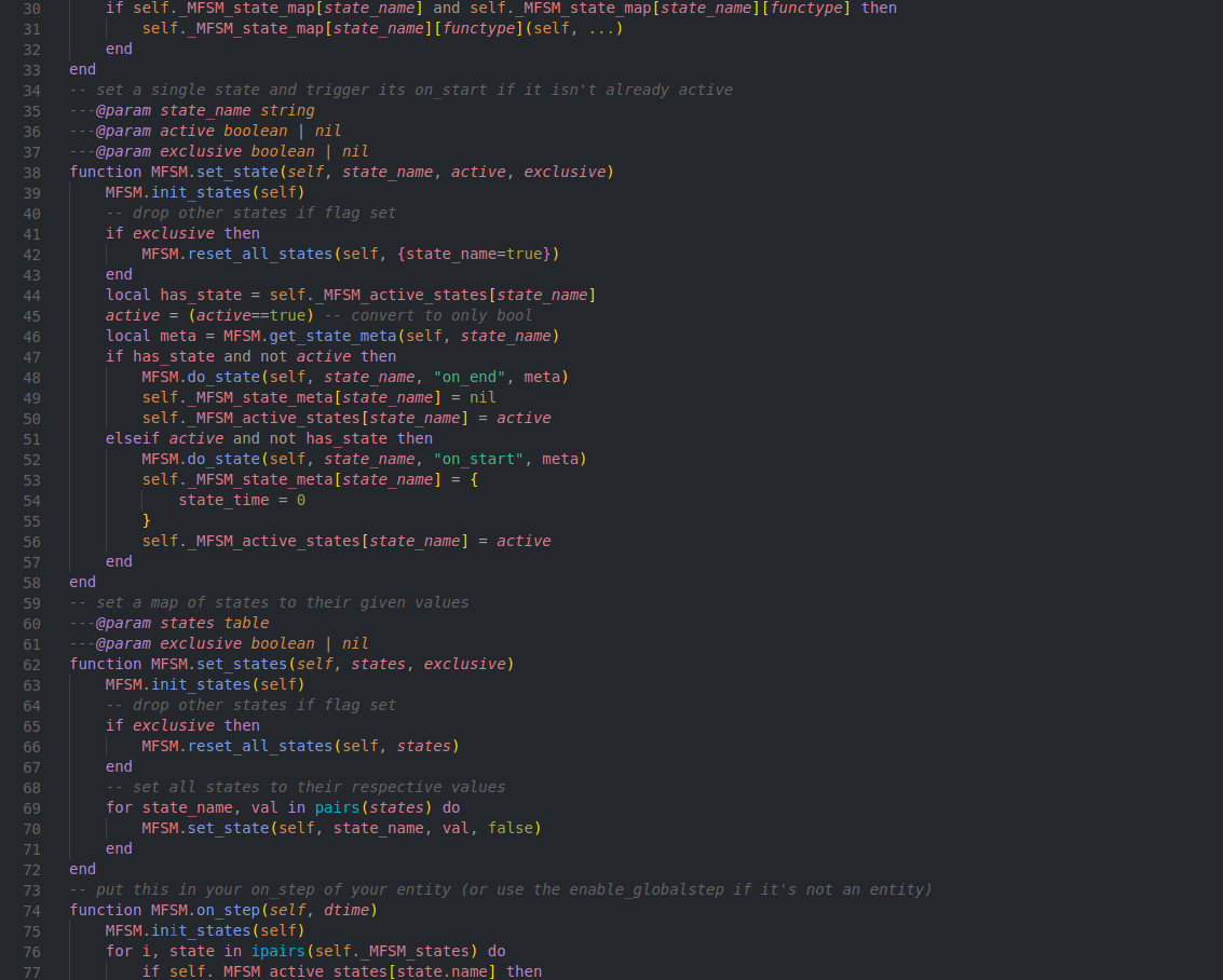 All of these can also be self:method() or my_statemachine:method() instead of MFSM.method(my_statemachine), so you can call them from within the statemachine itself.