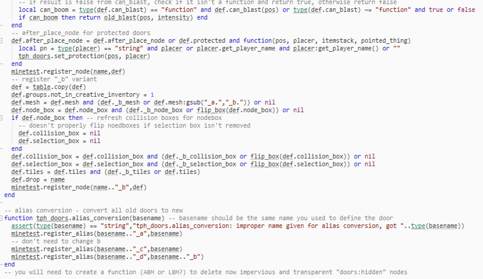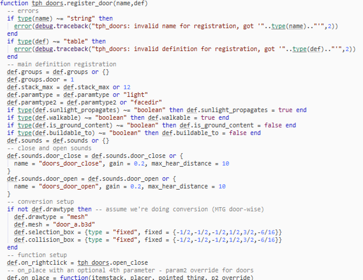 This is intended to ease developer's woes with designing doors + adding a lot more customization and permitting more functionality and conditions. There's a lot more functions to your doors that you can specify such as the doors_interact callback and you now have the ability to use nodeboxes to make doors.
