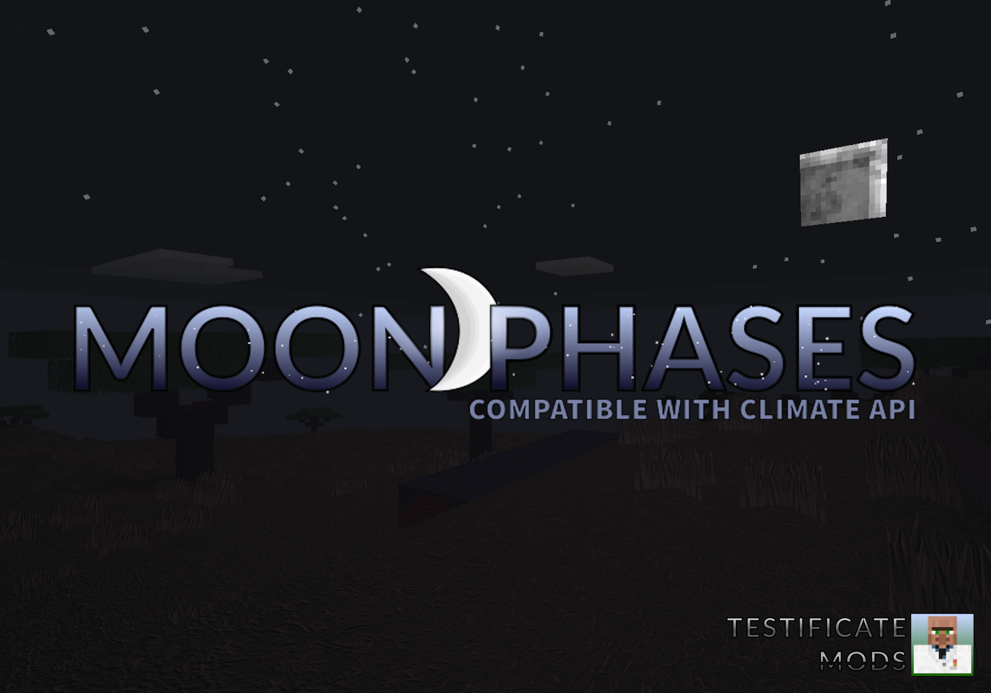 Changes the moon to follow a cycle between eight different phases. The mod uses either custom made textures or free NASA photography to rotate between multiple textures. It provides an API for other mods to change or retrieve the current phase as well as chat commands. The cycle length of 32 days can be adjusted with the configuration.