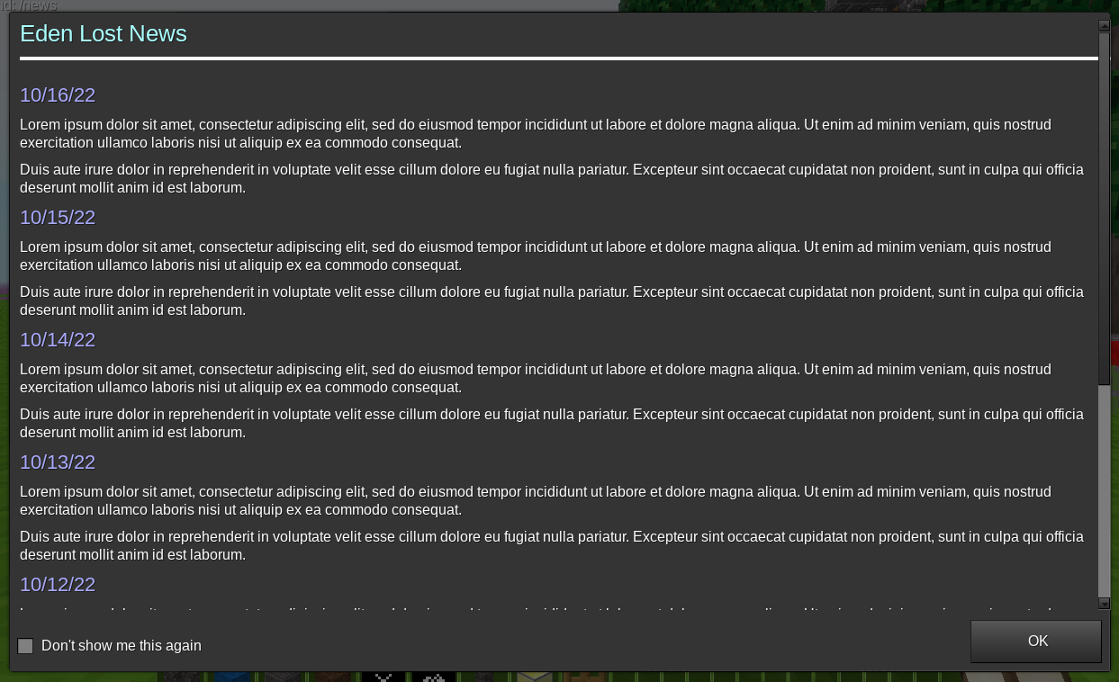 Once a player logs in to the server, they will be shown a dialog with server news. Depending on their language settings, different dialogues will be shown. This mod comes with sample news dialogues for English, Spanish, French and Italian.