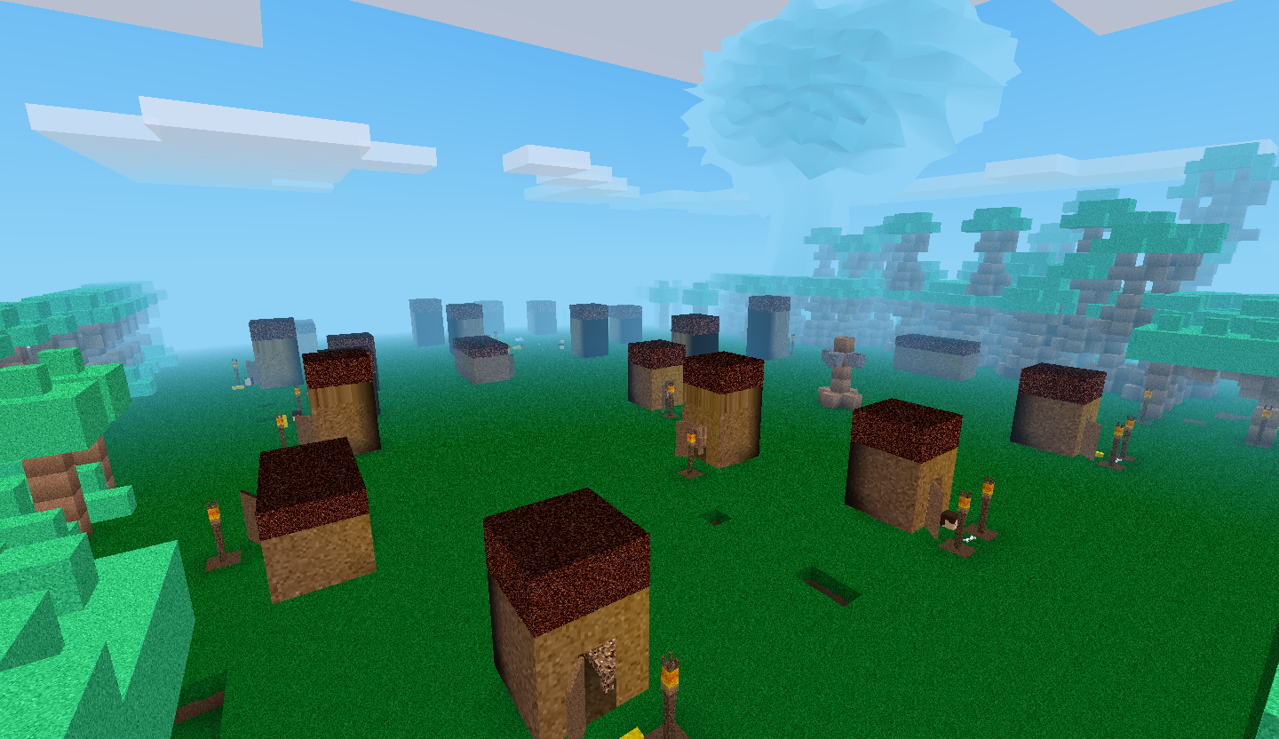 Some formspec elements don't match up correctly, and the giant tree is pink, but doesn't appear to be missing a texture, so I'm not really sure what's going on with that. Some of the body parts laying around just float in the air. Shacks appear to have some sort of shading issue on the back of them. The underlying concept could work, but needs a little love.