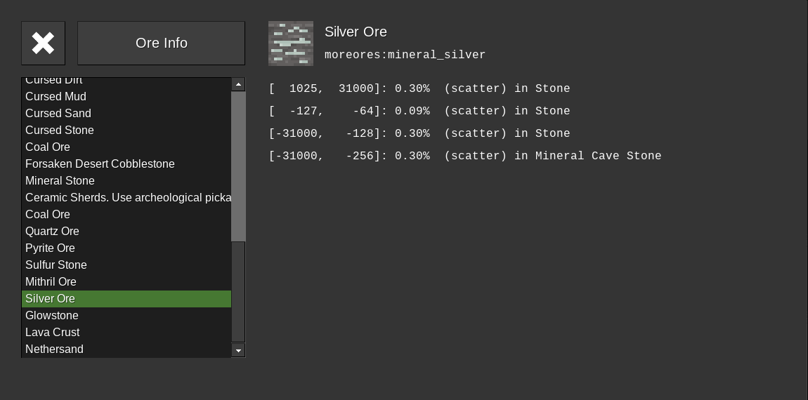 The Ore Info mod creates a menu to view the depth and rarity of groups in which ores generate. Created by TwigGlenn4