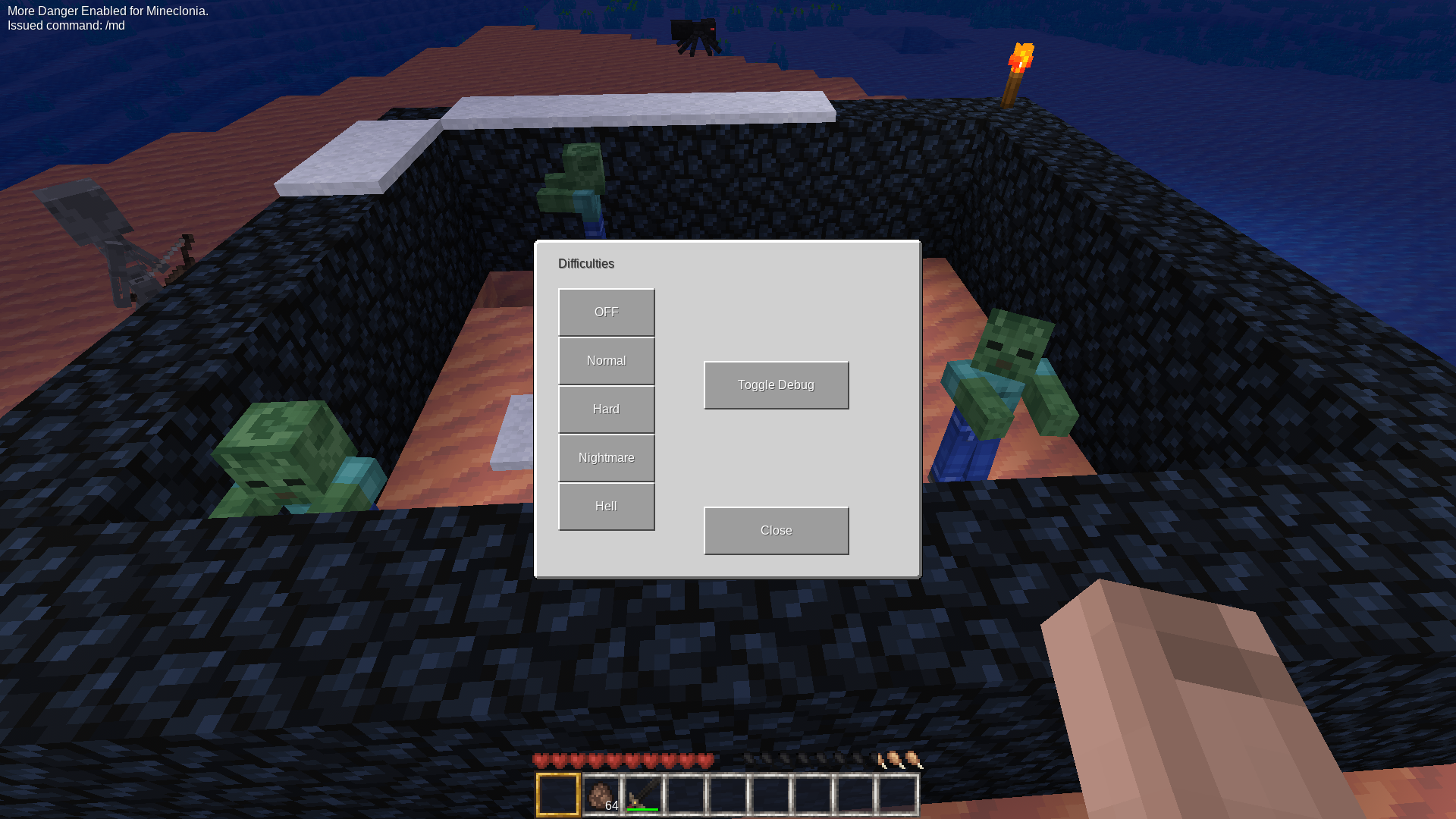 /md for GUI /moredanger mode <normal|hard|nightmare|hell> /moredanger_off /moredanger_mode = tells you the current mode /moredanger_debug = toggles debug mode on and off, this is mainly for viewing hps of mobs
