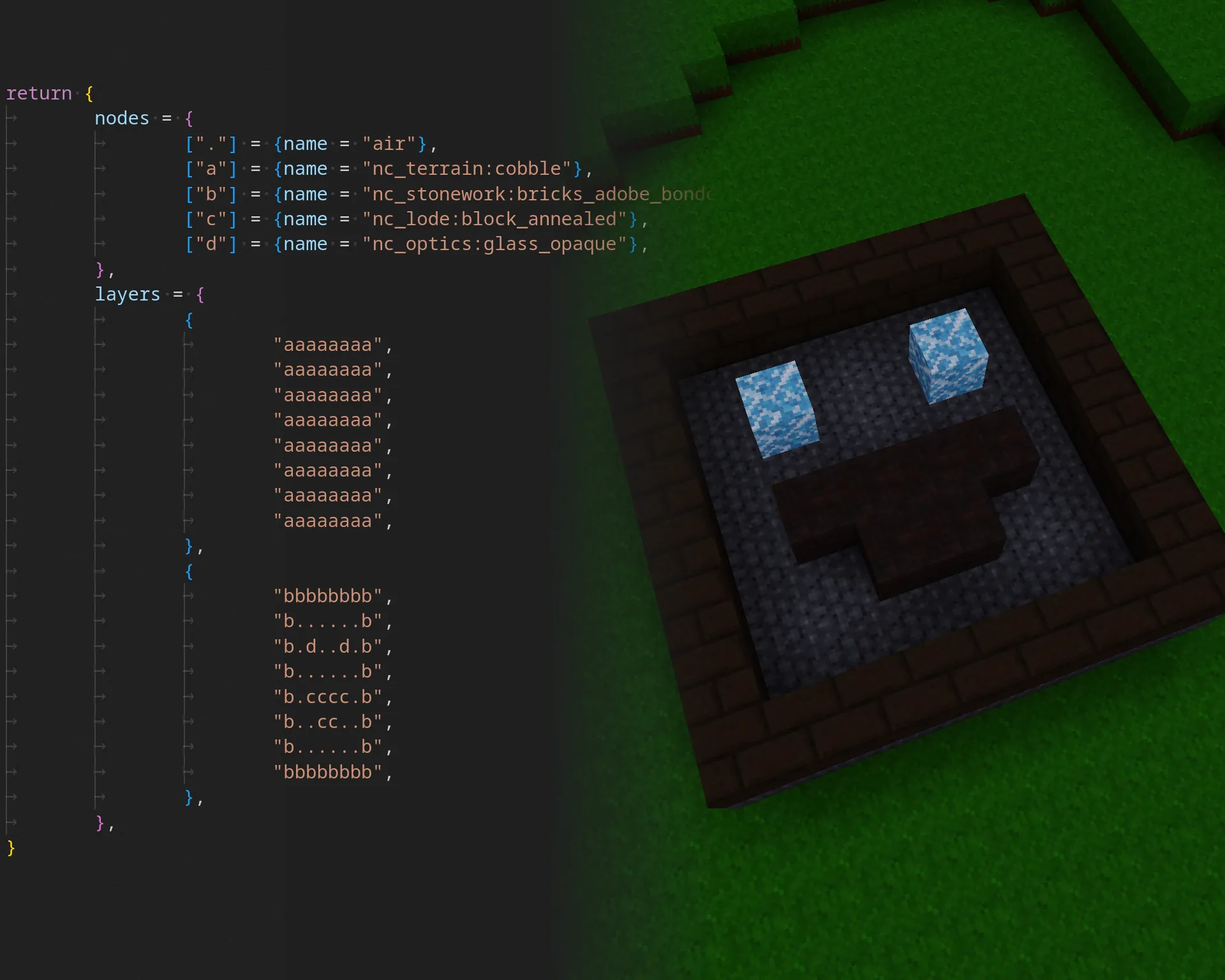 This format make it very easy to see most topographical structures, orient yourself within the map, and find specific areas where changes need to be made. It is likely the most convenient format for maintaining changes without use of a 3D schematic editor. Unlike other Lua formats that try to emulate this while retaining structural compatibility with the standard Minetest format, it's still readable when reformatted by code formatting tools.
