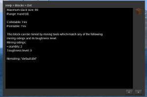 This mod also allows for mods to adding custom written description and usage help texts in free-form and even custom automatically generated texts for mod-specific information like flammability in Minetest Game. This is one of the core features of this mod; the mod relies on other mods to provide their custom help texts for a complete help.