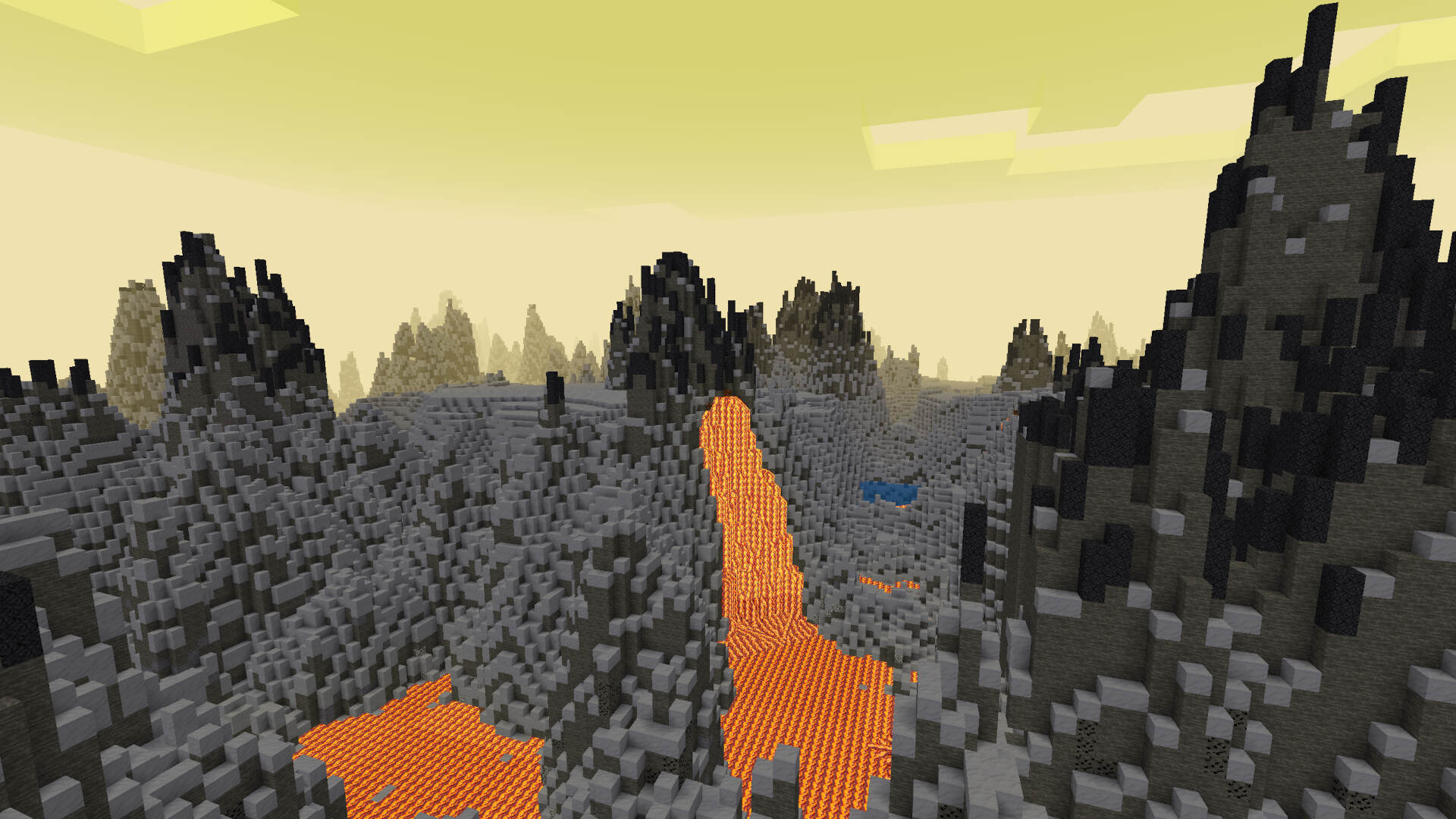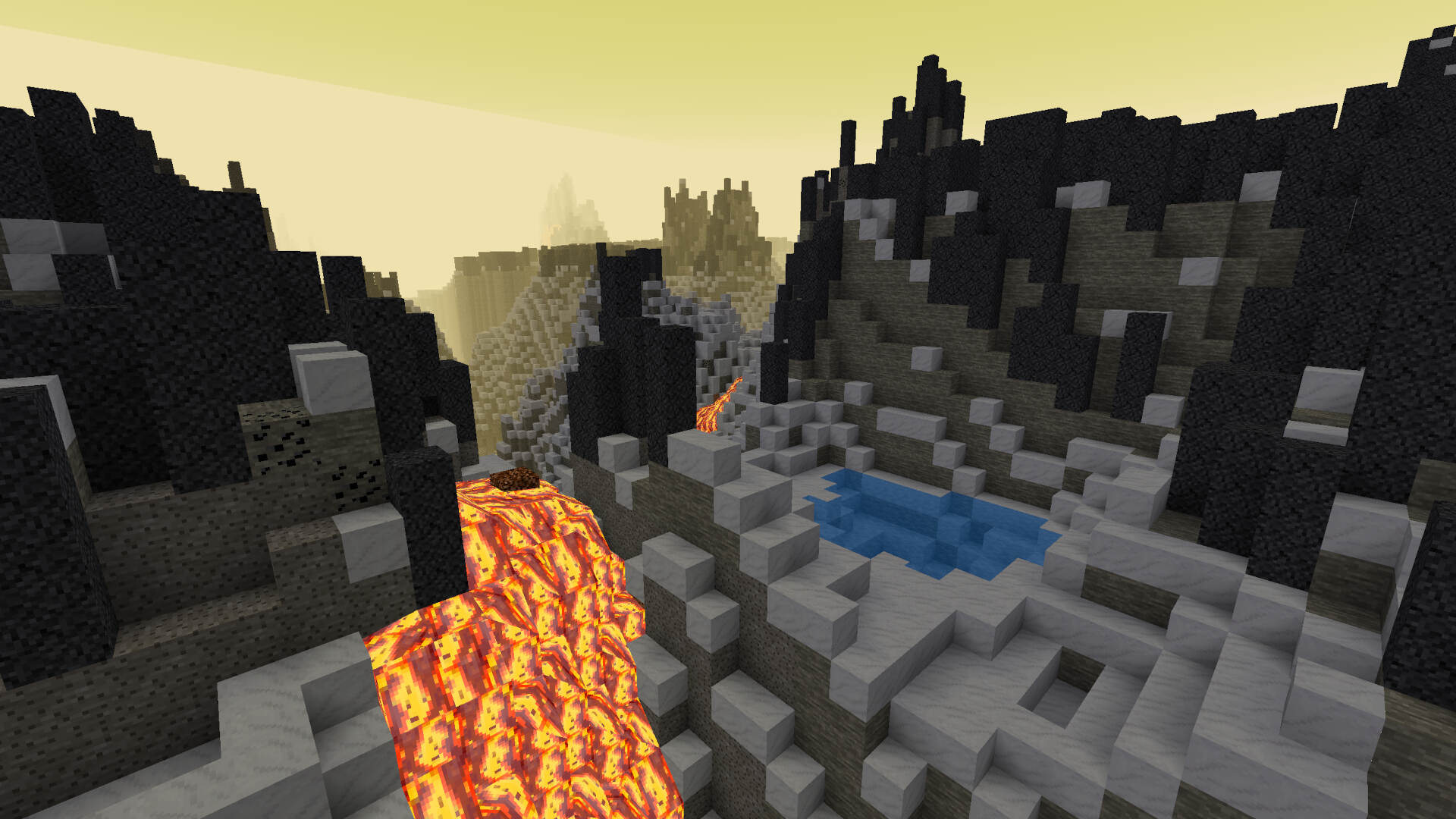 You still have a pickaxe and a few apples. Also, water is hidden inside the tall and chaotic stone spires. So your only chance of survival is to search for water, use your crafting skills to form some soil and plant apple trees. More plants might follow. The underground holds great riches, but also great dangers, lava is death. With your new acquired resources, maybe, just maybe, you will turn Planet Hades into a nice, habitable place.