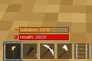 Eating: Players have to eat food such as apples to restore satiation. Food will no longer directly restore one's health! In other words, the hunger mechanic works exactly like in the “Better HUD” mod from BlockMen. Note that in BlockMen's mod, satiation can go up to 30, too. But satiation levels 20-30 are always displayed as 10 bread symbols. This mod, however, always shows the actual satiation. Food poisoning: Very simple. When you eat poisoned food like a red mushroom, you lose health points for a few seconds (but your health can never go below 1 with food poisoning).