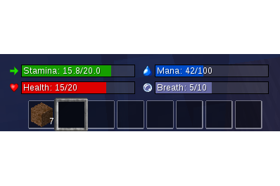 This mod replaces the builtin health and breath indicators by nice little “progress bars” which show an icon, a label and a numerical value plus maximum.