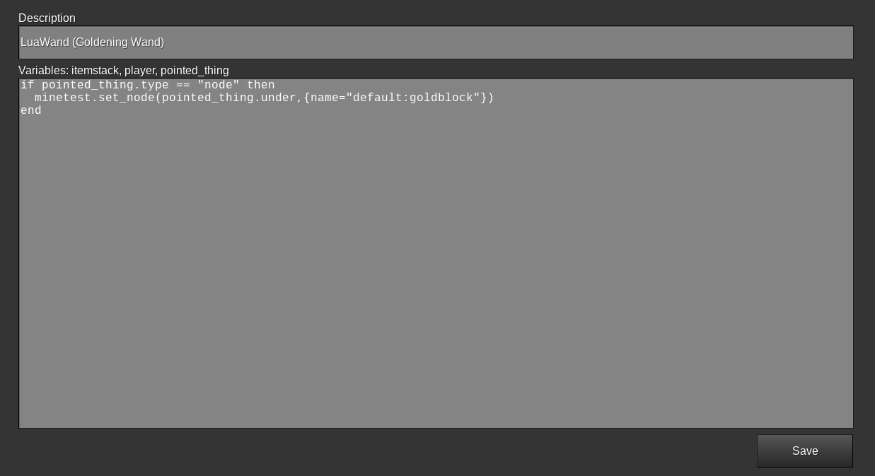 itemstack, player, pointed_thing) are provided. - Press "Save" button to apply configuration.