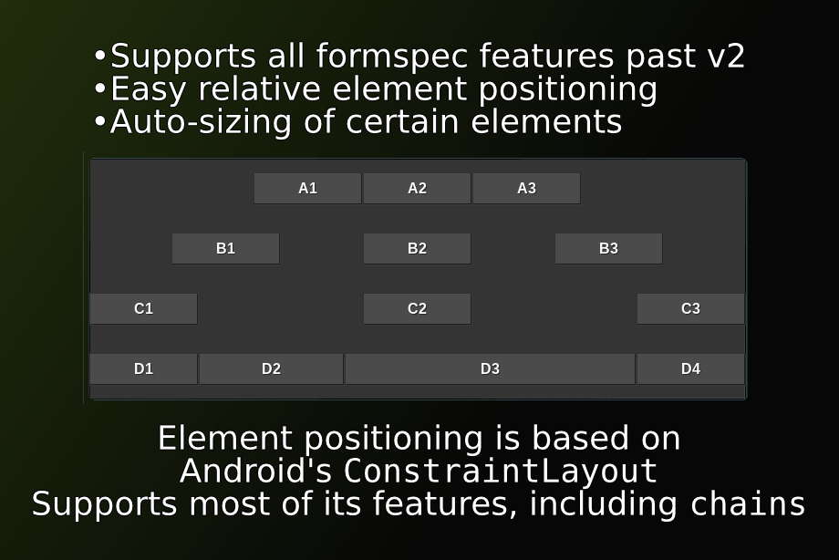 Respec's system of positioning and sizing of elements uses relative positioning, which is inspired by and strongly based on Android's Constraint Layout, with which Respec shares many similarities (e.g. chains).