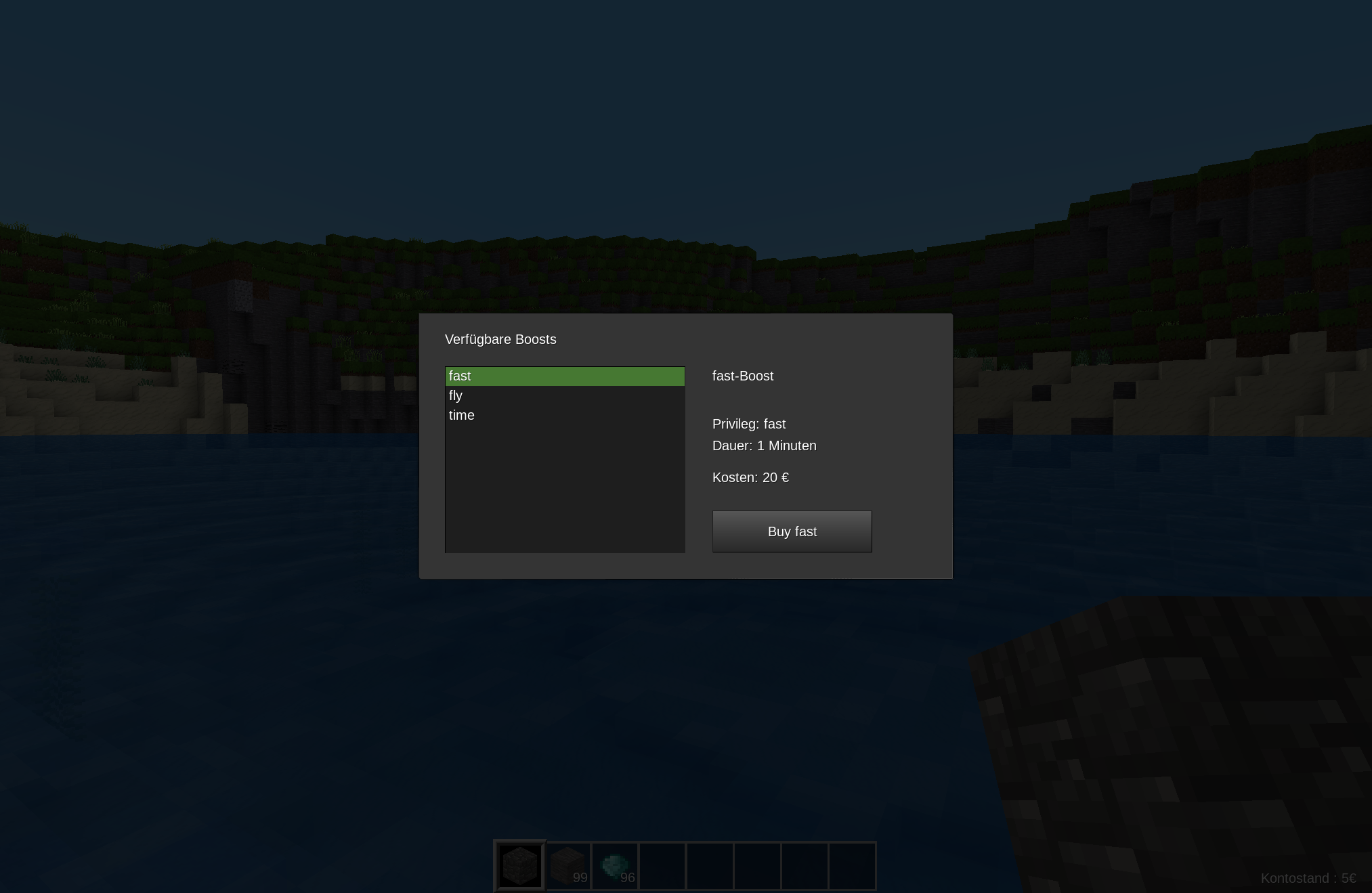 priv- Name of the privilege the player should be granted temporarilyduration- Timespan of the temporary privilege grant in secondscost- Table defining the cost of the boost - for a boost to be free set this tofalsetype- "item" when paying with item, "money" when using payment modstack- conditionally required with "item" cost type - table defining an ItemStackitem- Name (id-string) of itemcount- Item count