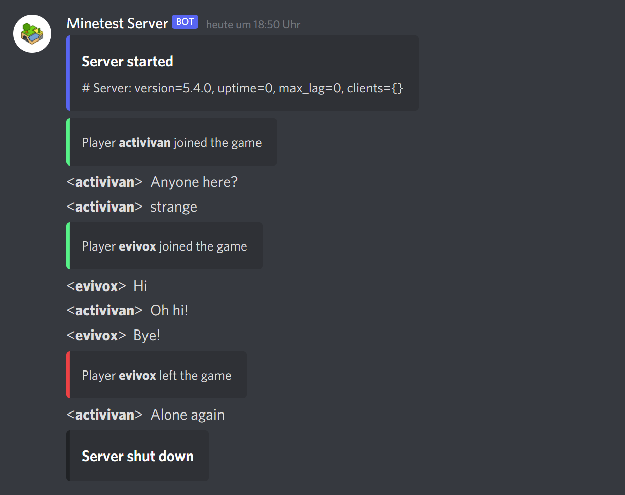 Do note that since it uses webhooks rather than a full Discord bot, it only bridges in one way from Luanti to Discord, and not the other way around.