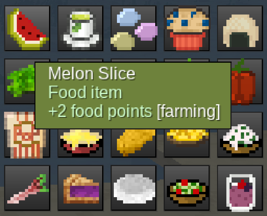 Displays saturation points for food. Supports food items without problems, with the eatable group. For many other mods, this group is added intentionally.