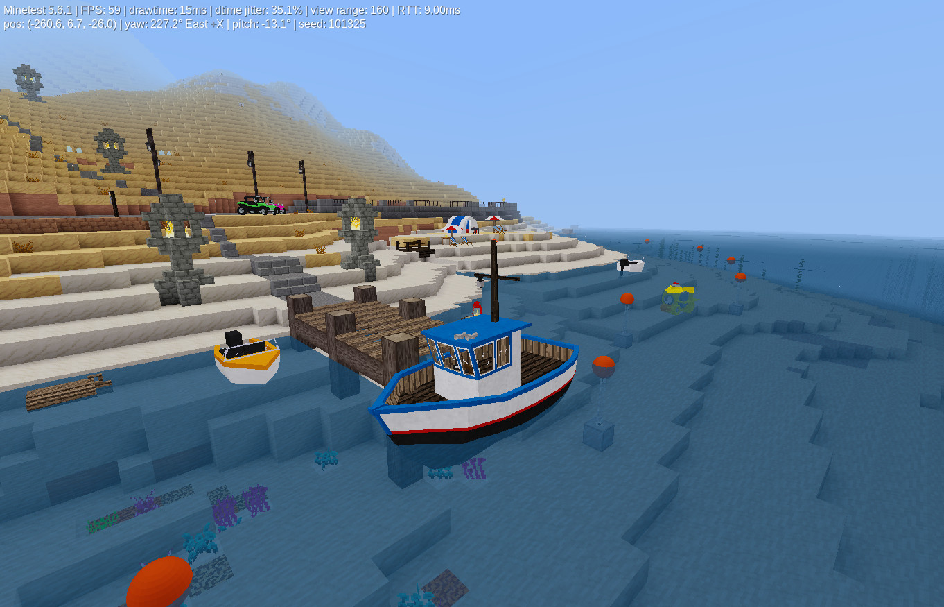 The latest of the masterful vehicles created by APercy. This is so far the pinnacle of boats. It's just so immersive to take its helm and drive around Minetest's seas and rivers! This is still WIP, so I expected some bugs, but there aren't really any in there that I have found at the moment. The only trouble I have had for now is slowing down enough to drop the anchor, it seems to want me to stop almost completely, even if I am barely crawling along it won't let me drop it. The only thing we are missing now for proper harbours is buoys, like in the screenshot.
