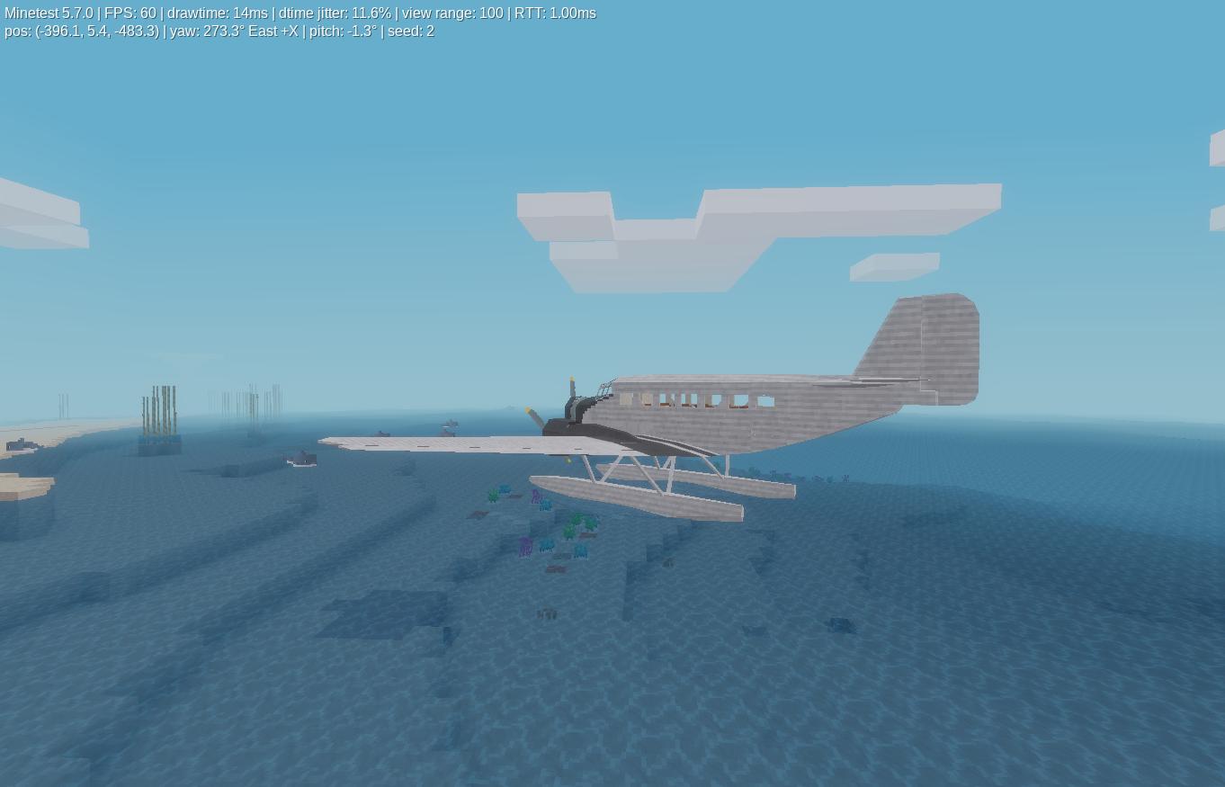 This mod is a version of the german ju52 for minetest. It is under development, so it does not yet have an autopilot nor the planned automated airline system for the future. But it is already flyable, and can carry up to 12 occupants.
