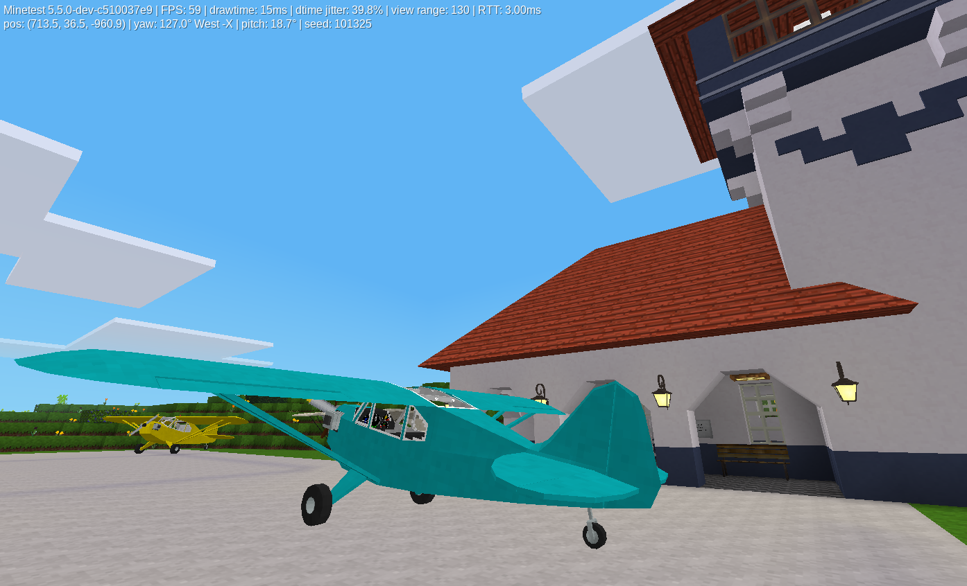 cool mod, like microsoft flight simulator in minetest, but when i fly the plane it sometimes lags and the plane sounds also stop (for a split second). Also the plane sometimes struggles to catch up with where the actual player is (most likely because of speed). Other than that, great mod.