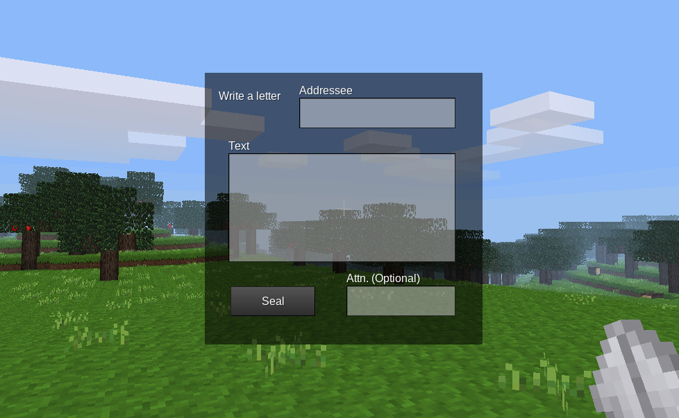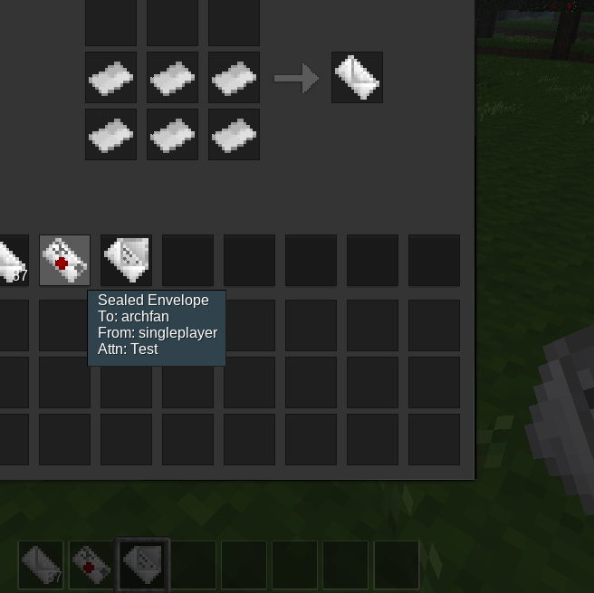 Blank envelopes are crafted with 6 paper. Punch with a blank envelope to open the letter-writing formspec, which allows you to specify an addressee, letter text, and an optional "Attn." field which will be displayed in the envelope description. Once writing is complete, the envelope is sealed by pressing the "Seal" button. The blank envelope is then replaced by a sealed envelope which shows the sender, addressee, and optionally the Attn. field in the description. If the addressee punches with the sealed envelope, it will become an opened envelope, which, once punched, shows a formspec with the text. While a sealed envelope can only be opened by the addressee, an opened envelope can be read by anyone - thus, secret correspondence should be pulverized!