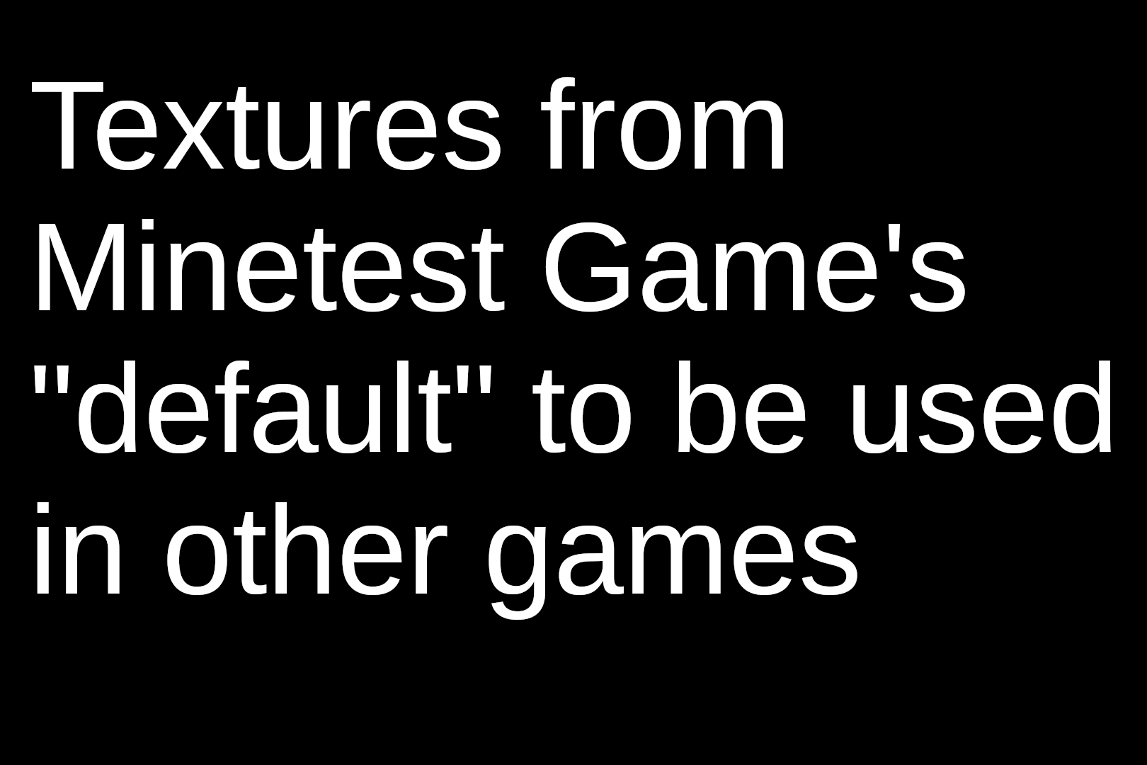 Mods that use "default" textures from Minetest Game, can use this mod instead to supply themselves with textures, in other games for the Luanti game engine. Using this mod assumes you are not using Minetest Game, do not use this mod with Minetest Game, as this mod serves no purpose for you there. This mod adds the "default" textures to be used in other games for the Luanti engine outside of Minetest Game