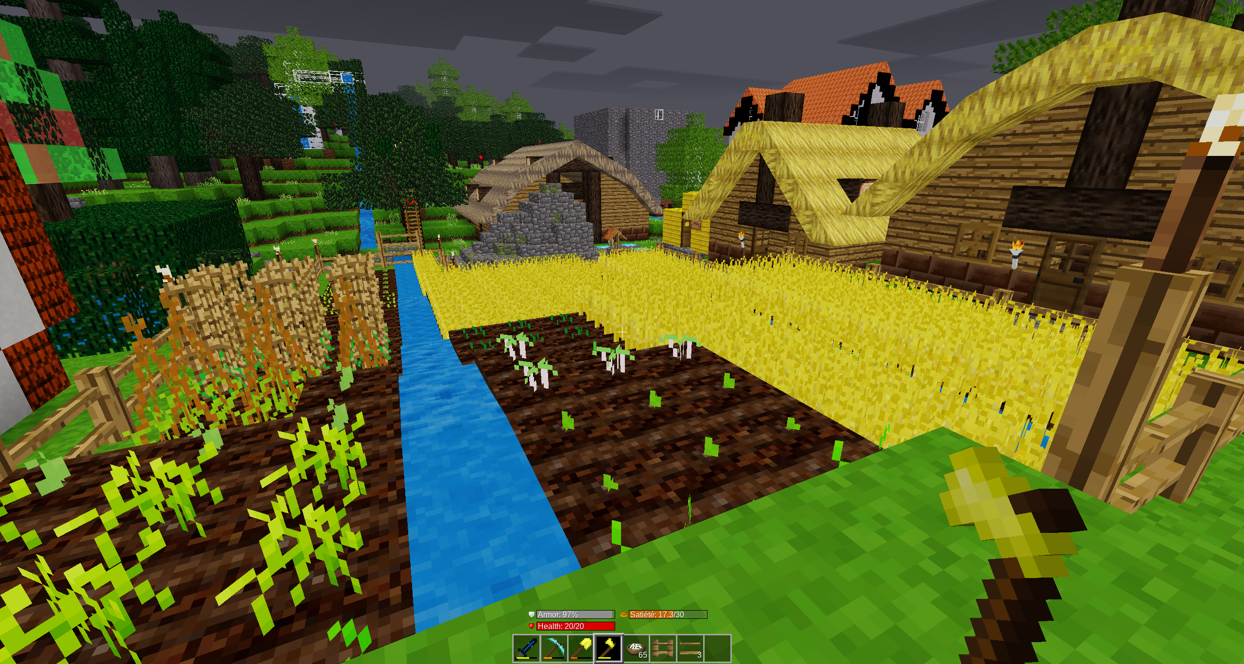 Upon entering the game, the player will see what appears to be a plain Mintetest Game. After a brief moment of exploration, harvesting grass and cutting trees, you may come across some vegetables. Those can be harvested and re-planted to begin farming and be saved from starvation. Paying close attention to the surroundings, sounds and weather effects bring additional ambience.