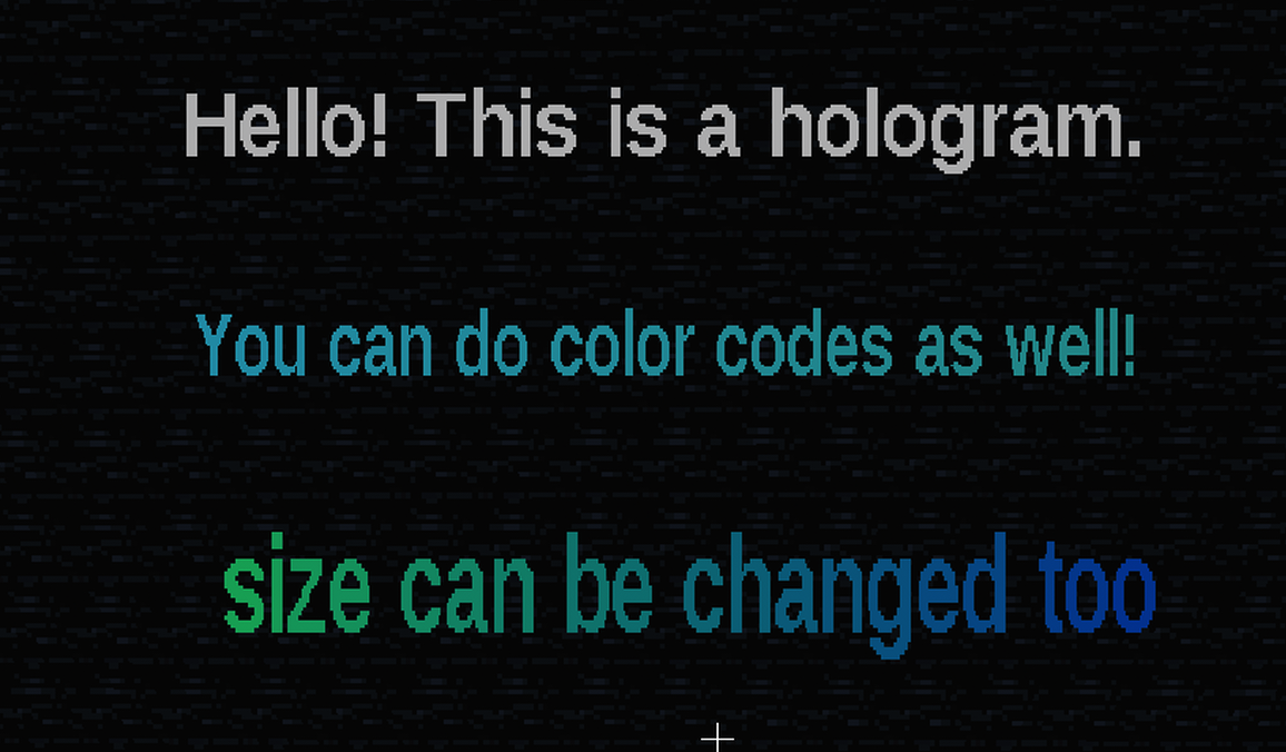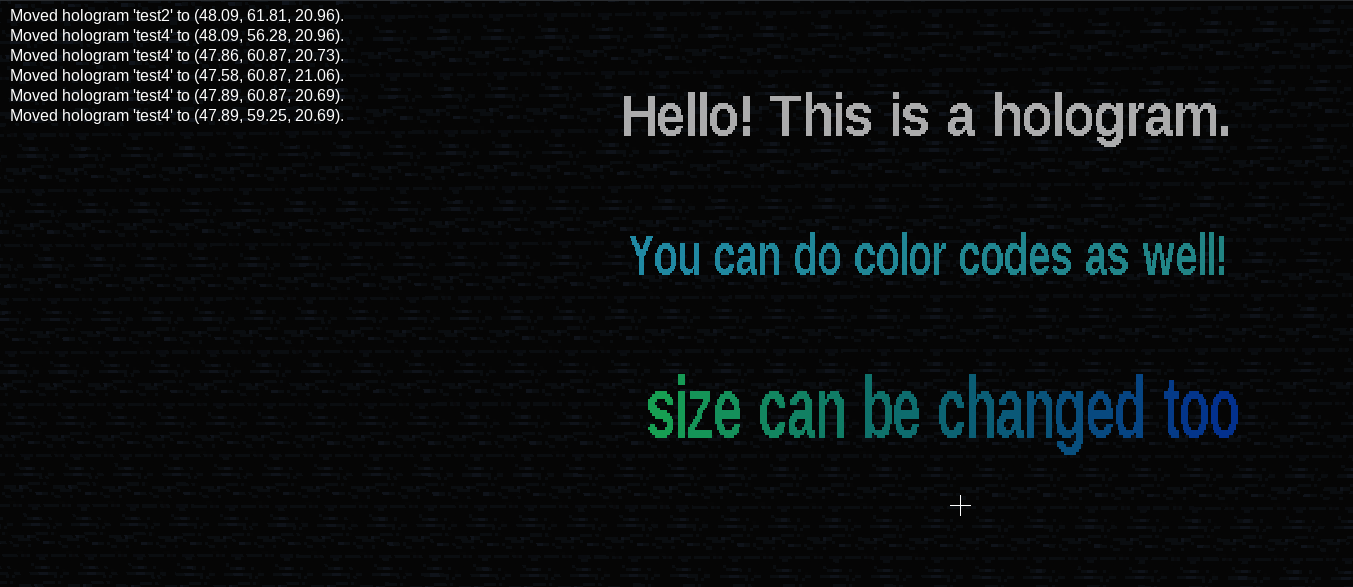 /hologram add <name> <here|x,y,z|~,~,~|~,~2,~4> <text>/hologram move <name> [here|x,y,z|~,~,~|~,~2,~4]/hologram edit <name> <text>/hologram list/hologram delete <name>/hologram size <name> <scale>