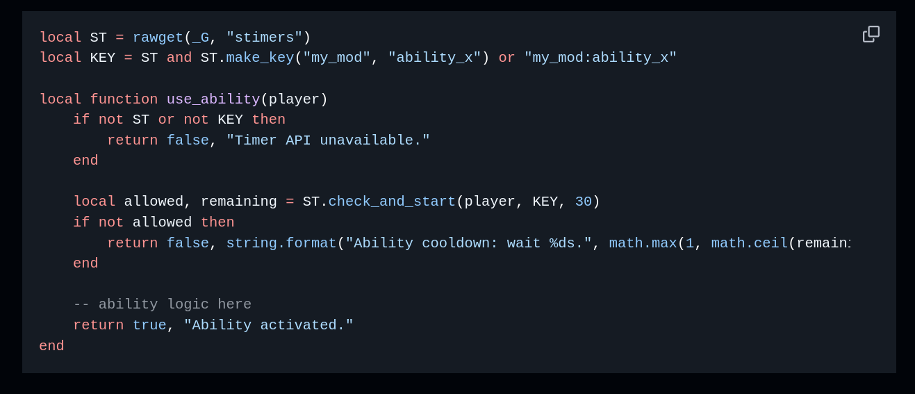 stimersto your moddependsinmod.conf. - Build a namespaced key per cooldown.