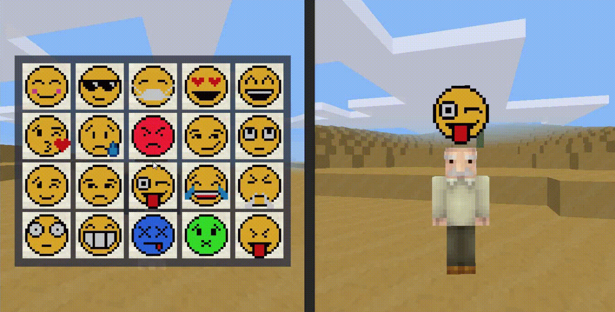 "Emoji" show emoji icon above player with command "/e" or with text smiles in chat like 'o_O'