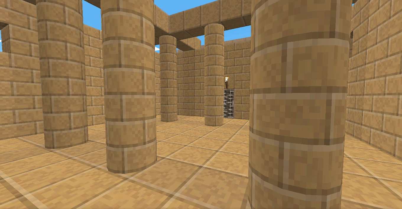 I was really happy to see a game taking place in some sort of Ancient Egypt: the first map was really on point talking about level design, wide outside and narrow inside. A few decorations more would have totally helped, and as general taste I would avoid completely round objects inside a voxel game (ie. columns).