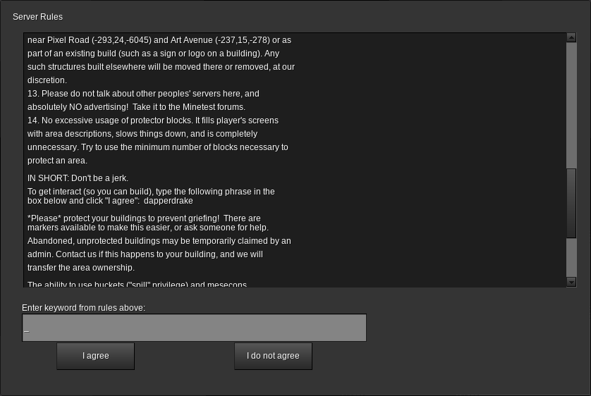 This mod asks players without interact to read the server rules and optionally prompts for a keyword from in said rules to be entered, at which point interact is granted. Multiple keywords are supported and the current one selected for a given player will be inserted into the rules at a location marked by "@KEYWORD".