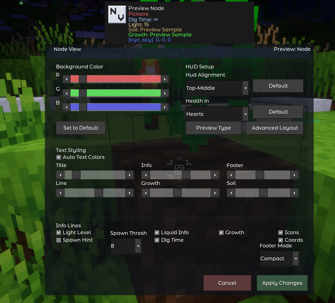 Eye Spy adds a live HUD that shows you everything about whatever you are looking at — the node name, which tool breaks it fastest, how long digging takes, the current light level, crop growth and soil status, entity health, and more. Every detail is configurable through an in-game editor with live preview, and the HUD updates continuously as you look around.
