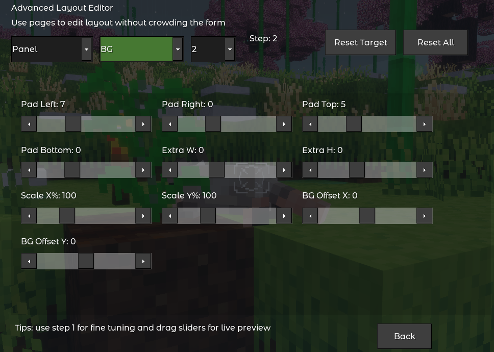 | Panel | Background padding (left/right/top/bottom), extra width/height, background scale % |