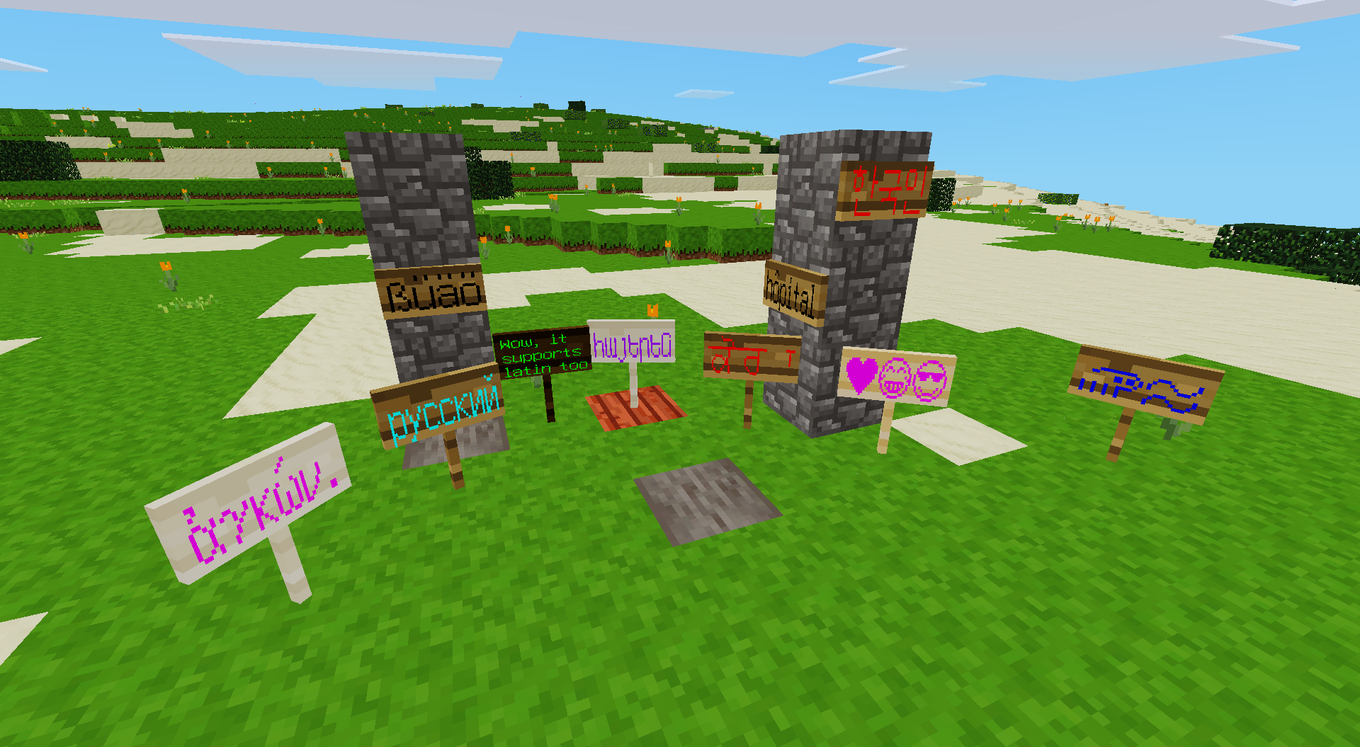 unicode_textmod thatucsignsuses I may be a bit biased, but this is exactly the kind of signs mod that I madeunicode_textfor.As the description correctly states, with this mod you can have text on signs that Minetest can not even render in its interface using the fonts it comes with. As this includes the text input fields that players use to write on signs, this mod is best used with the standard font set to GNU Unifont and the fallback font set to GNU Unifont Upper. This font combination does not account for any CSUR glyphs, but it seems to be a limitation of Minetest that users can not stack an arbitrary amount of fallback fonts.