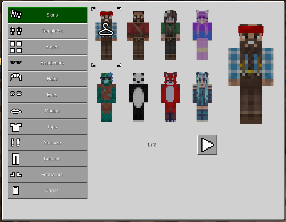 This is a skin mod for VoxeLibre (formerly MineClone2). It allows server admins to upload and configure custom player skins in the world folder instead of a mod or game folder. This is so updates to mods or games won't overwrite custom skins.