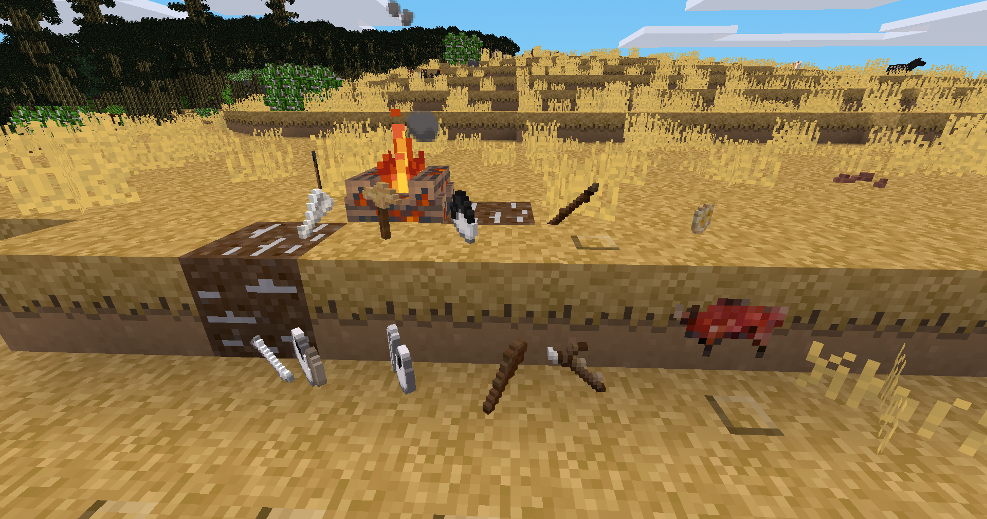 This mod adds basic stone age and survival tools and makes the start in the world harder. You can make a campfire. Torches just burn half a day. Several mods have been merged or are depended on that adjust the game-play.