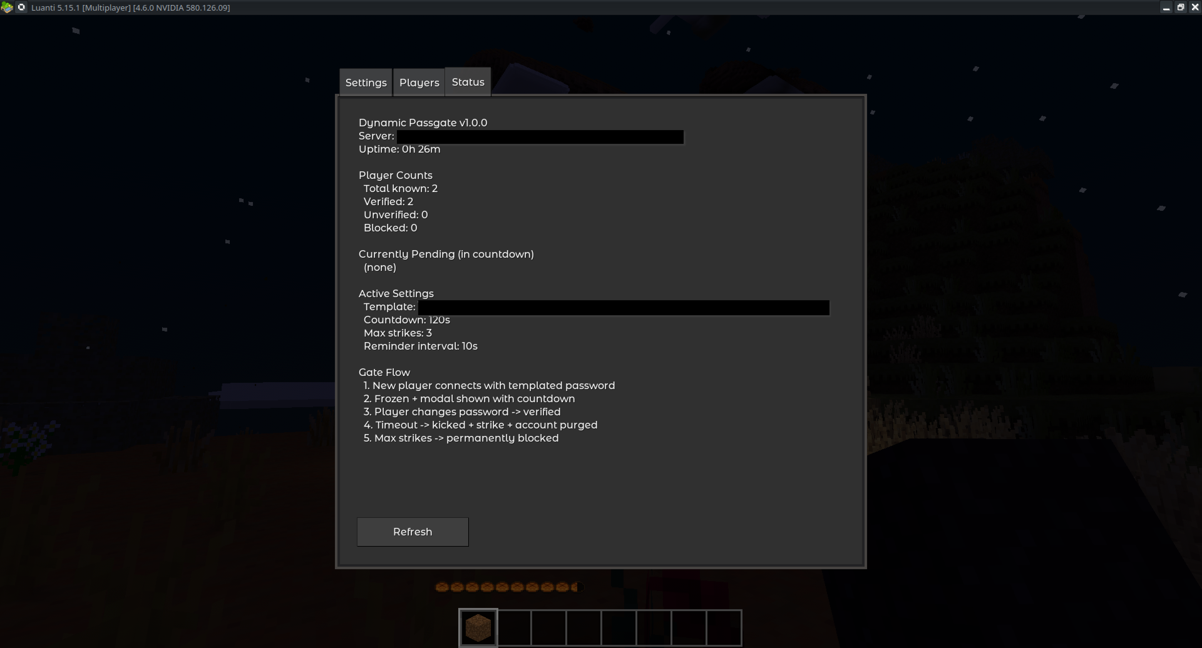 world.mt:load_mod_dynamic_passgate = true - Restart the server