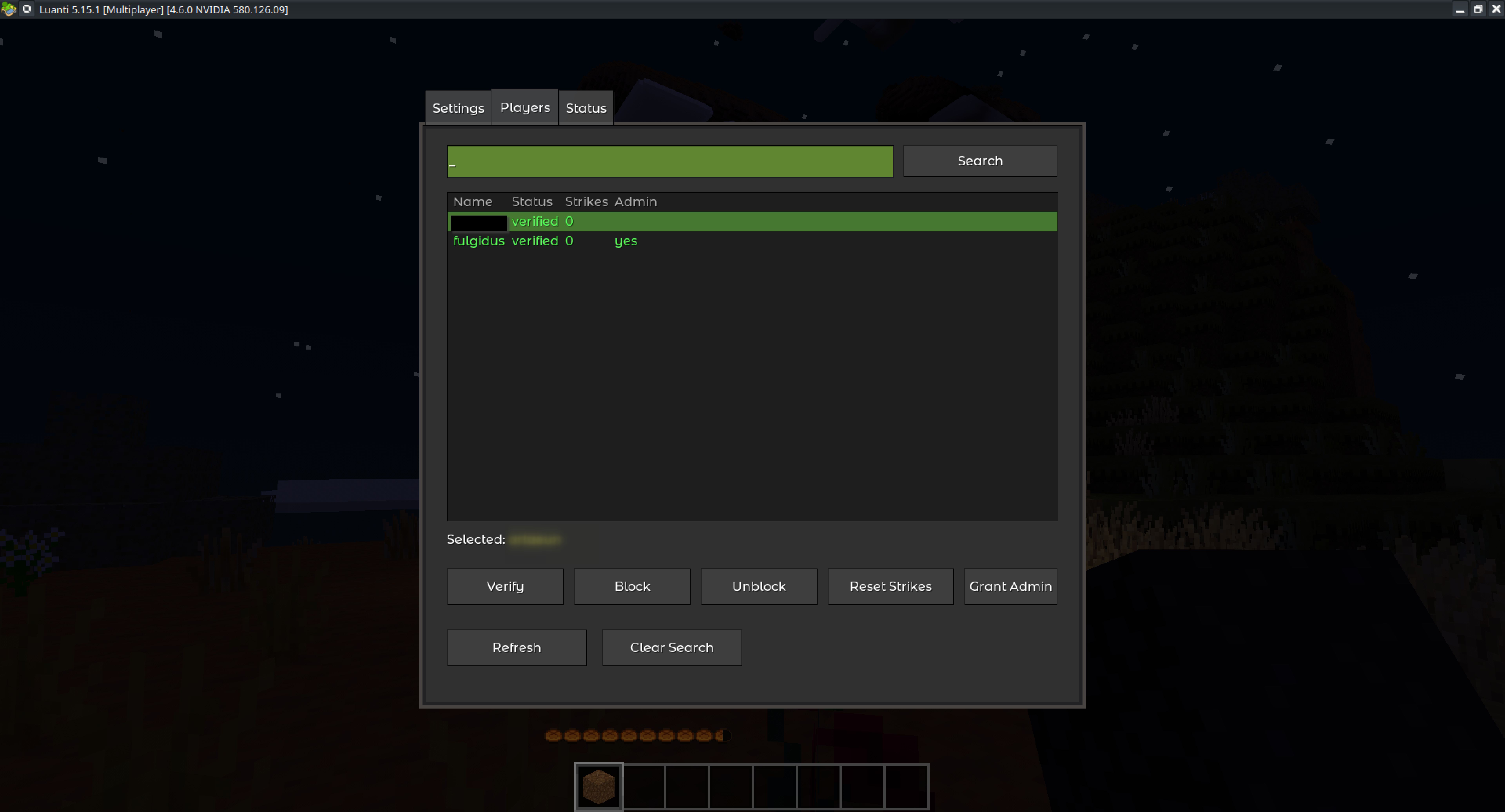View all known players with their status (verified/blocked/unverified) and strike count. Select a player to: