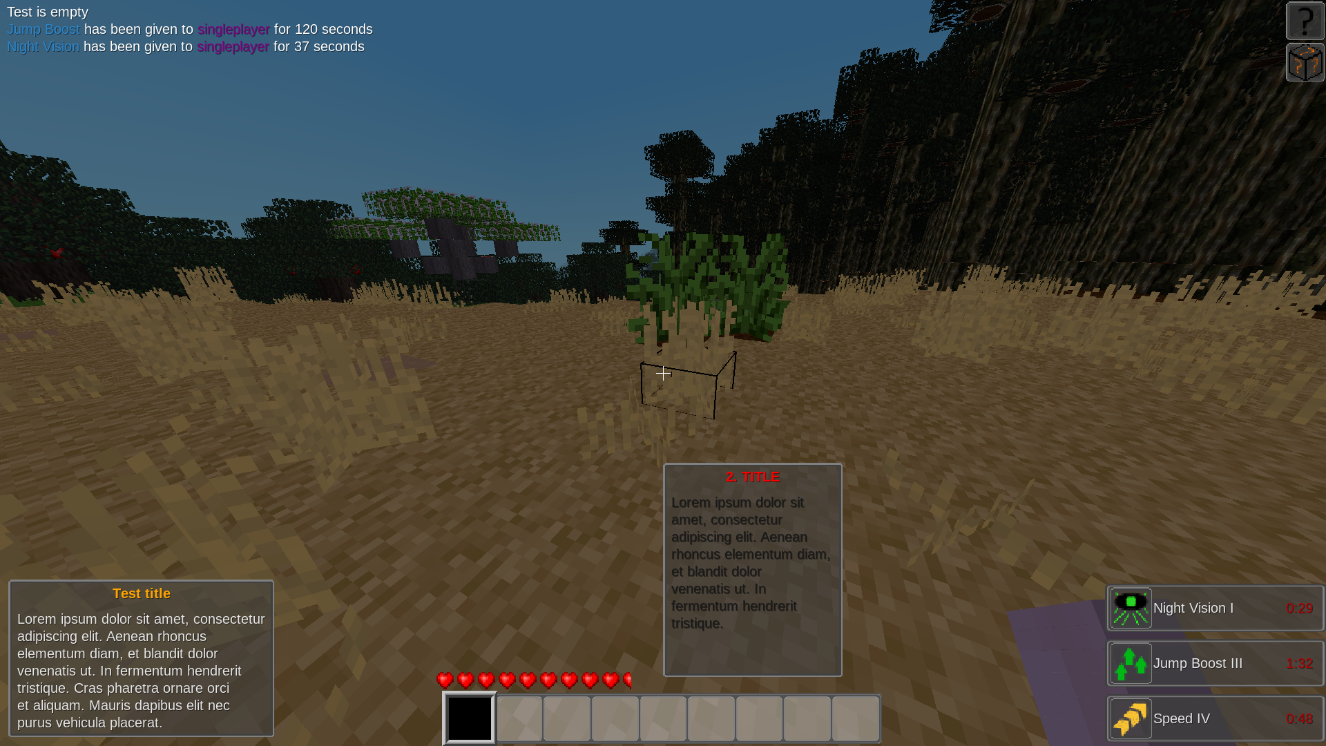 To test in-game features preview (this mod doesn't aim to add content but functionalities) use these commands: