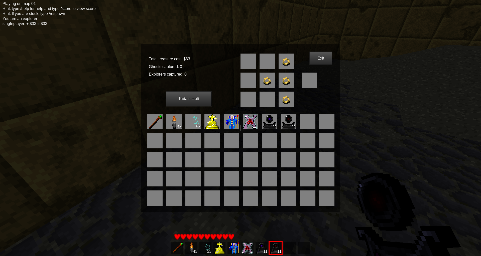 rotatebutton in your inventory to rotate the shape. - Only explorers can collect treasures. As an explorer, your goal is to fill your inventory with treasure of maximal value while capturing or avoiding as many ghosts as you can.