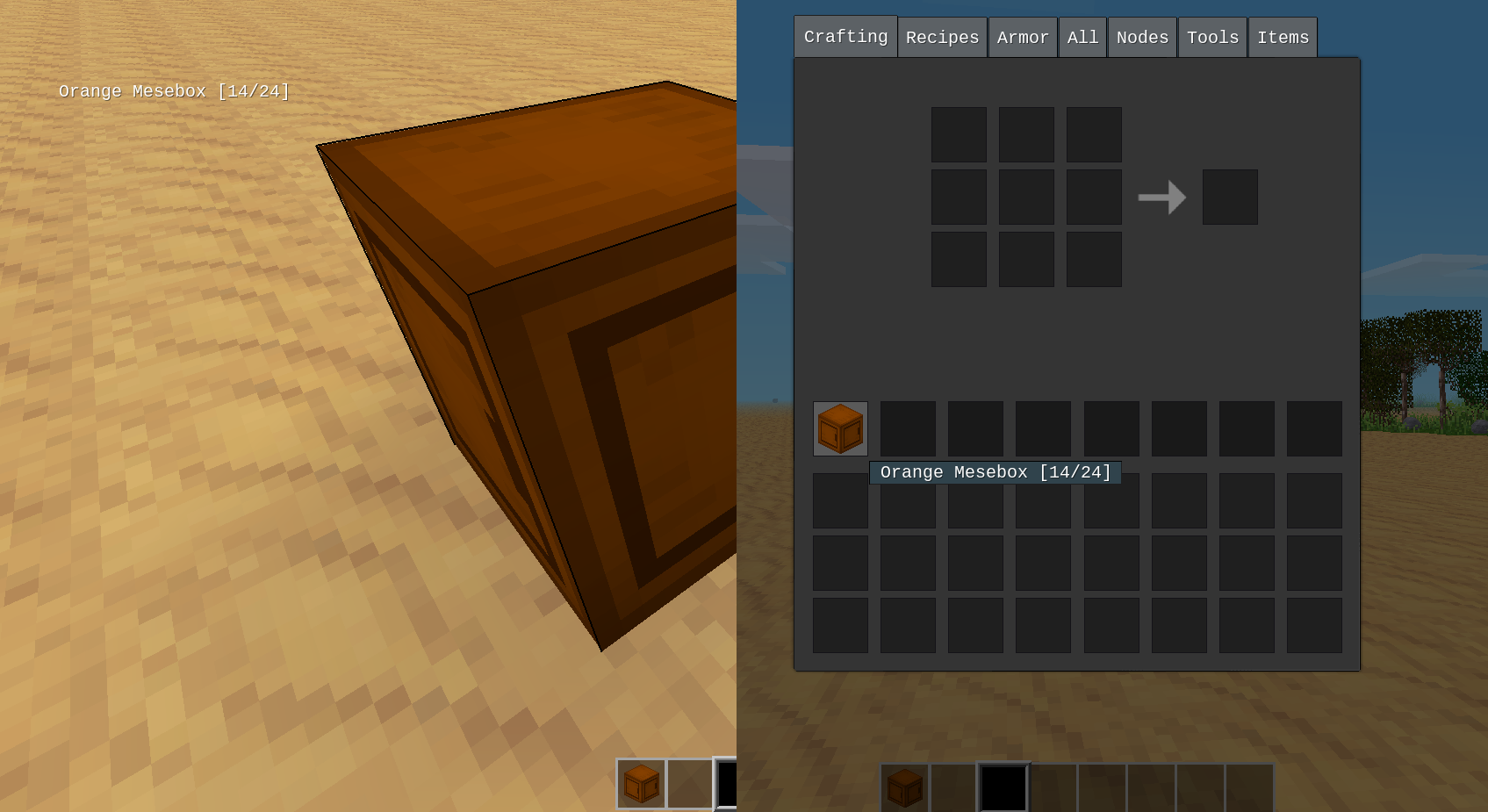 There are still many mysteries surrounding Mese, the ore that can be found deep underground. Some say even it's of alien origin. Recently, however, scientists have unlocked one of its mysteries and invented the Mesebox. The power of Mese combined with a storage box creates a storage that can be dug and carried without losing its content. Truly revolutionary! The original recipe crafts a Mese-colored Mesebox and if combined with dye, Meseboxes of various colors can be crafted.
