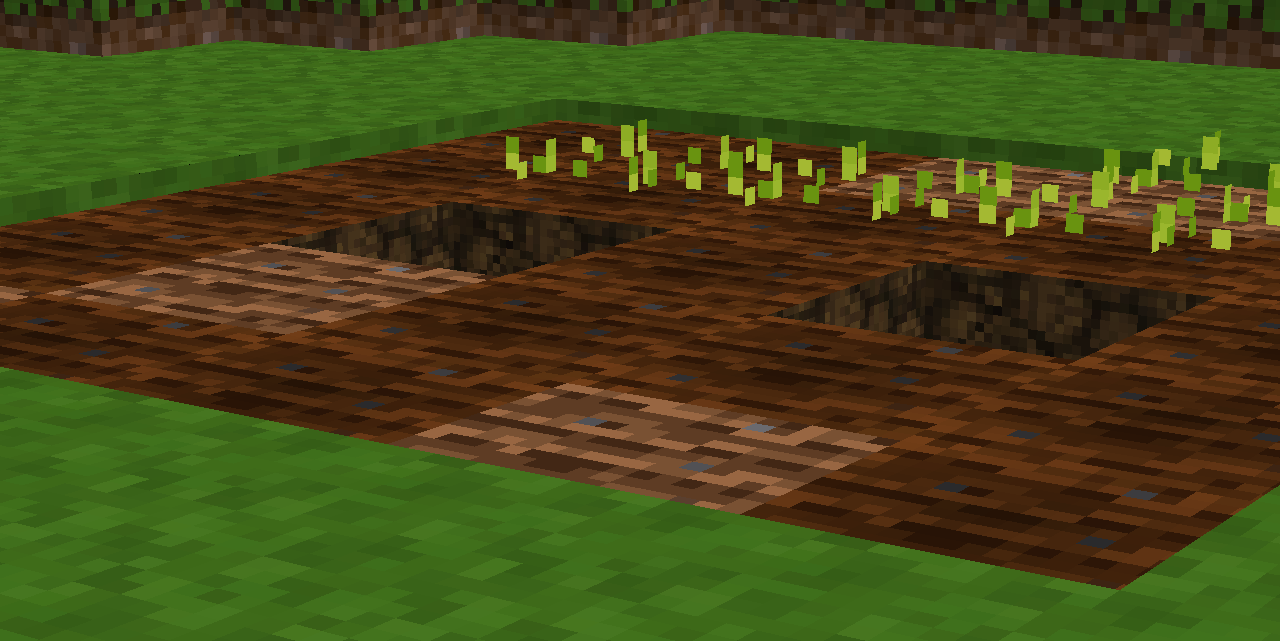 PT-BR Transforma o solo capinado para ficar mais baixo, ciando um relevo de 1 pixel de altura, fica parecendo que o solo foi cortado com exada, Caso queira remover o mod depois de usar todos os blocos ficaram normal novamente. Erros: Chão escuro Todos os blocos colocados no chão antes do mod ficarão escuros, para resolver remova e coloque novamente algum bloco próximo. Altura, por ser um bloco mais baixo fica ate bom em relação as gramas, porem as água ficam mais altas do lado dele, e estranho mas não interfere no funcionamento.