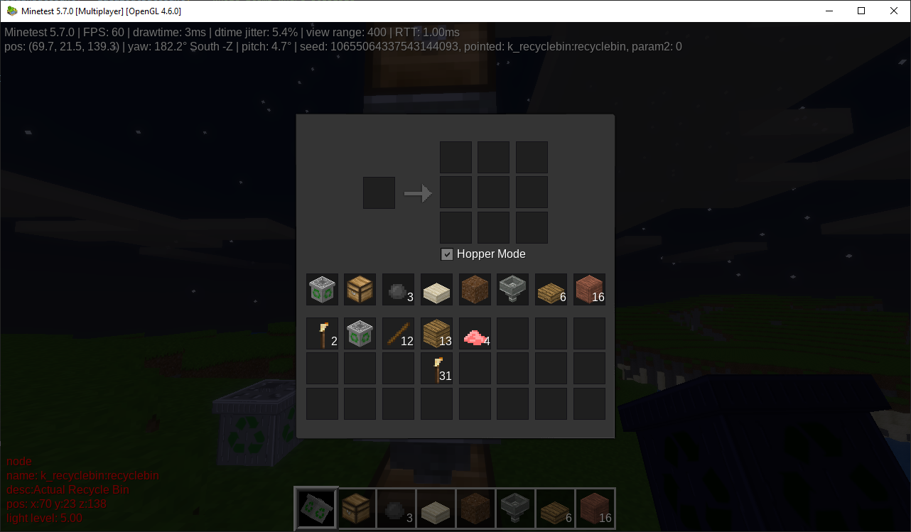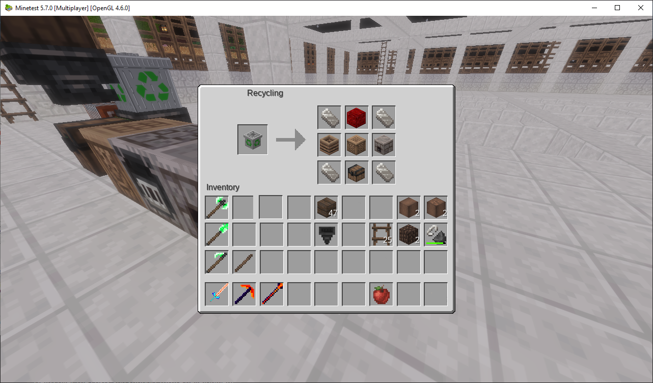 This is me just poking around with minetest mods and this one is mostly usable for my tastes. Other recycling mods exist but I haven't looked at them and have no idea if this is the socially acceptable way to go about this. If you don't like it, don't use it.