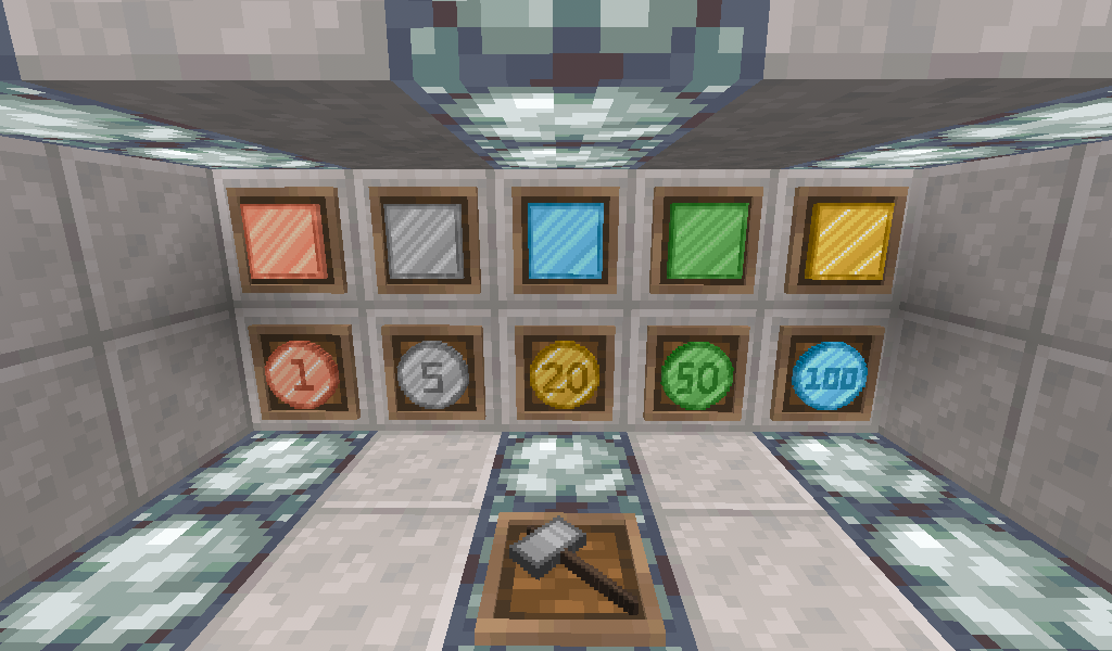 coins are crafted by putting the Hammer with various plates that are made out of certain minerals in a crafting grid. the plates are crafted by putting a Hammer with the respective mineral in a crafting grid. Both the recipes are shapeless.