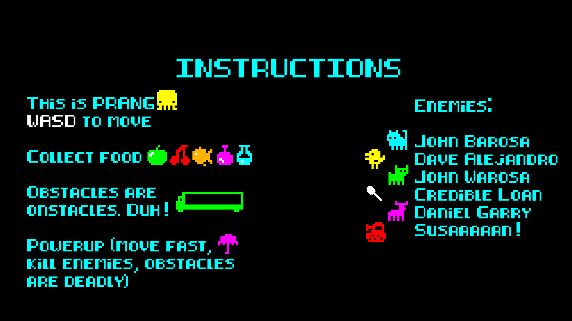 There are instructions on how to play inside the game. In short, you have to collect food/potions and avoid enemies. You can get a powerup (umbrella) to be able to destroy enemies, however obstacles are deadly while you have the powerup.