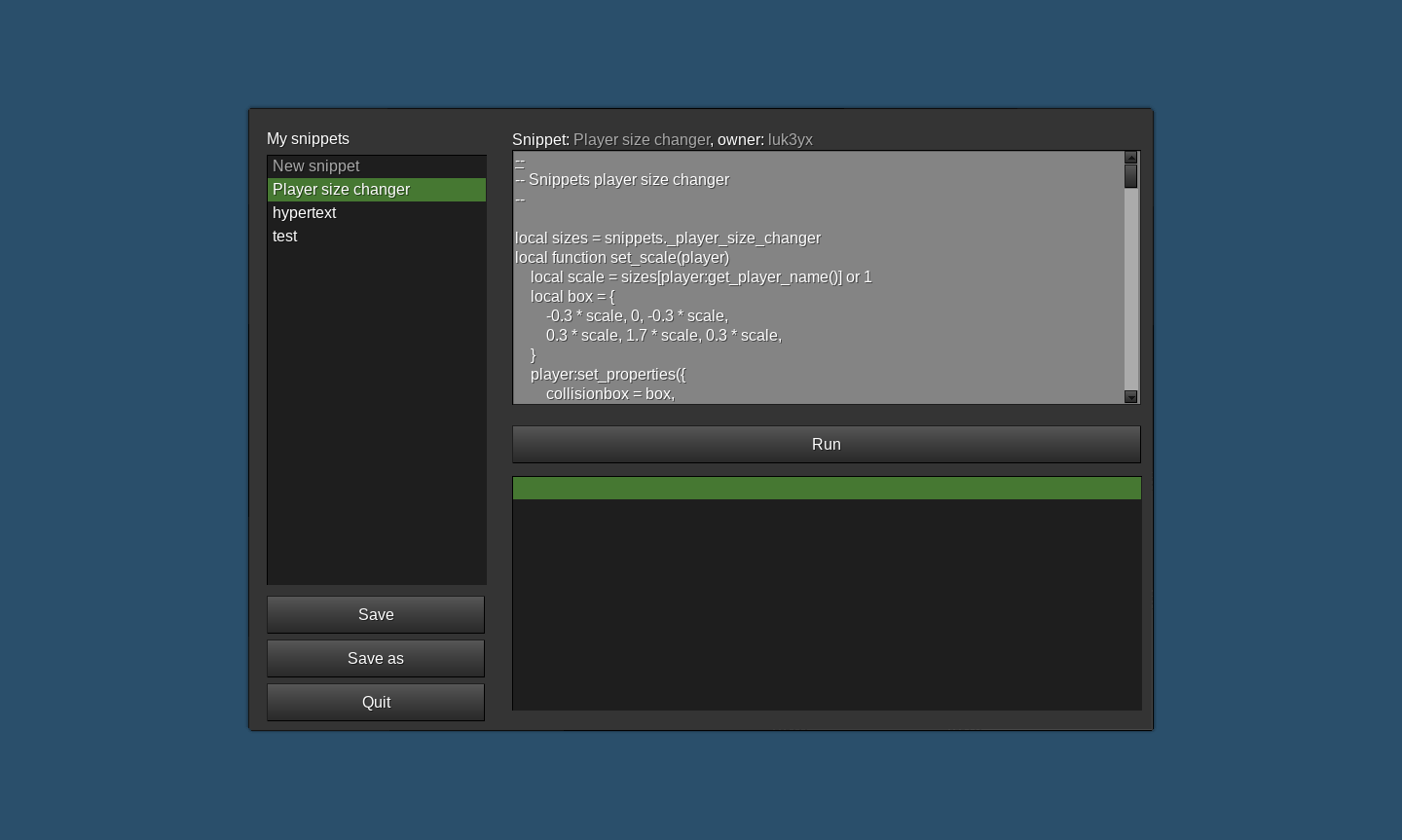 snippets.register_snippet(name, <code or def>): Registers a snippet.defcan be a table containingcode(orfunc), and optionallyowner. Ifpersistentis specified, this snippet will remain registered across reboots.snippets.unregister_snippet(name): The opposite ofsnippets.register_snippet.snippets.registered_snippets: A table containing the above snippets.snippets.log(level, msg): For use inside snippets: Logs a message.levelcan benone,debug,info,warning, orerror.snippets.register_on_log(function(snippet, level, msg)): Run when snippets.log is called.snippetis the name of the snippet. Newest functions are called first. If a callback returnstrue, any remaining functions are not called (including the built-in log function). Callbacks can check what player (if any) owns a snippet withsnippets.registered_snippets[snippet].owner.snippets.log_levels: A table containing functions that runminetest.colorizeon log levels (if applicable). Example:snippets.log_levels.error('Hello')→minetest.colorize('red', 'Hello')snippets.exec_as_player(player_or_name, code): Executescode(a string) inside an "anonymous snippet" owned by the player.snippets.exec(code): Executescodeinside a generic snippet.snippets.run(name, ...): Executes a snippet.snippets.Form(player_or_name): Creates a form.snippets.close_form(player_or_name): Closesplayer_or_name's currently open form.