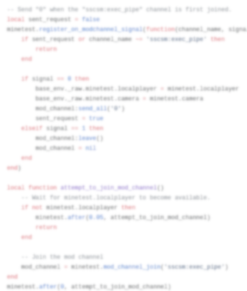 sscsm.every(interval, func, ...): Callsfunceveryintervalseconds with any extra parameters specified. Useminetest.register_globalstepinstead ifintervalis0.sscsm.restriction_flags: Thecsm_restriction_flagssetting set in the server'sminetest.conf.sscsm.restrictions: A table based oncsm_restriction_flags:chat_messages: Whentrue, SSCSMs can't send chat messages or run server chatcommands.read_itemdefs: Whentrue, SSCSMs can't read item definitions.read_nodedefs: Whentrue, SSCSMs can't read node definitions.lookup_nodes_limit: Whentrue, any get_node calls are restricted.read_playerinfo: Whentrue,minetest.get_player_names()will returnnil.