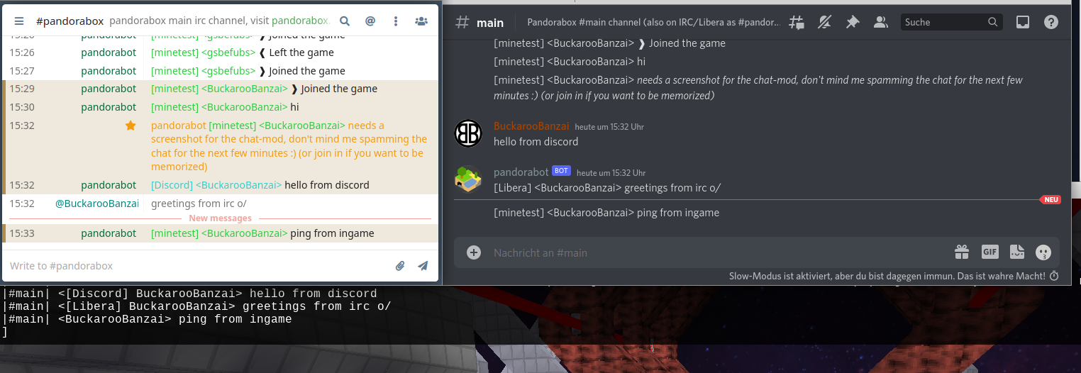 - Matterbridge-integration (IRC/Discord/matrix/etc)