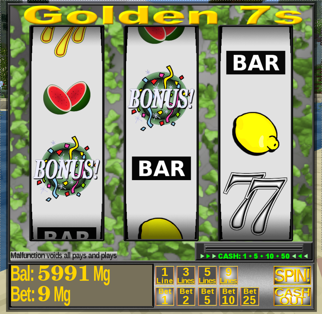 Provides an "engine" to drive simple slot machines (includes two). Spins reels, takes in/pays out in Minegeld (Dan's currency mod), etc.