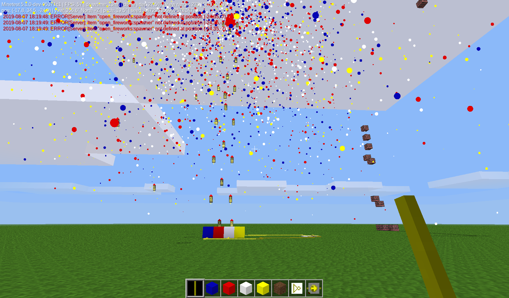 Nice fireworks, and we can easily create more colors in the code file, to make wonderful fireworks :) also i really appreciate that it works with mesecons, that way i can sit back and watch while the blinkyplants do their thing lol.
