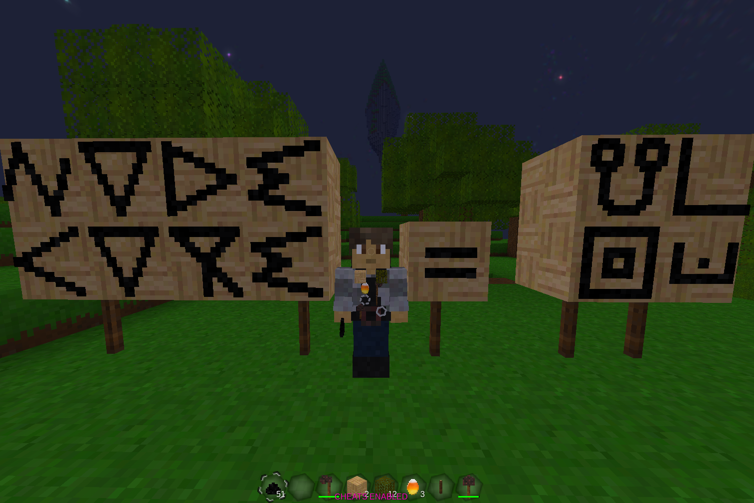 In the screenshot above, I translated "NodeCore" as "musi pi leko insa". "musi" means game, "leko" means square or cube, and "insa" means inside or core. "pi" means that the noun on the left is described by the phrase on the right, so all together, this means "cube-core game".