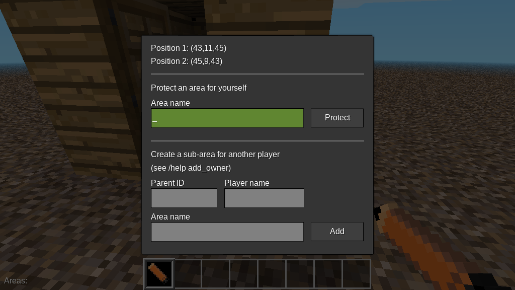 A useful little mod for easy zone creation if players are having trouble with the area commands. The GUI is clear and easy to understand. It's especially useful for transferring to other players or changing the area.